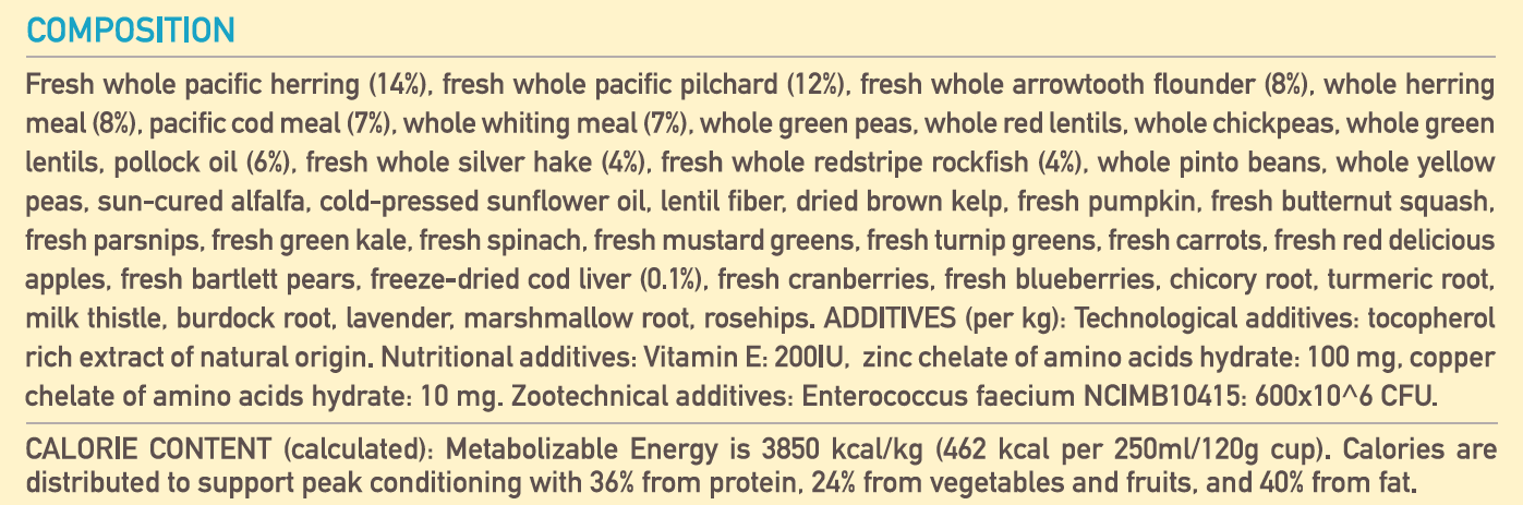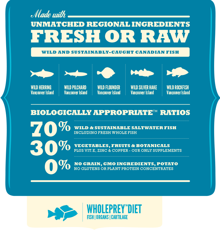 ACANA Pacifica is bursting with wild-caught herring, pilchard, flounder, hake, and rockfish that are delivered to our kitchen fresh or raw from people we know and trust.