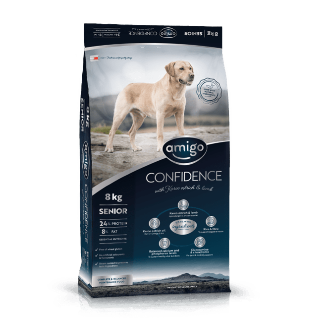 Because mature dogs have specific needs, Amigo Confidence Senior’s nutritional levels have been adjusted to support this sensitive physiological stage. This includes lower energy levels to prevent obesity and specific amino acids to prevent loss of muscle mass. Amigo Confidence Senior contains optimised levels of vitamins and minerals to support your dog’s immune system and prevent osteoporosis, as well as chondroitin and glucosamine to help with joint issues. Furthermore, it is enriched with prebiotics to help stabilise your dog’s digestive flora and contribute to her long-term health and well-being.